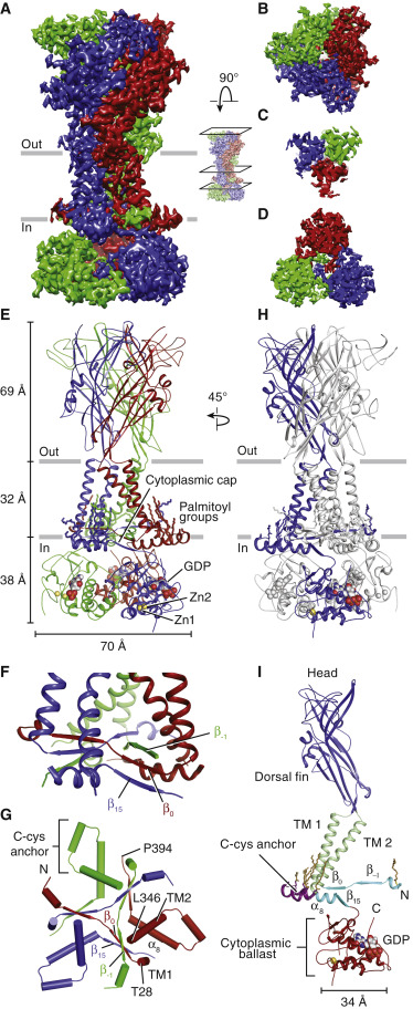 Figure 1. Overall Architecture of rP2X7 in the Apo State (A–D) The three-dimensional reconstruction of rP2X7 in the apo state, viewed parallel to the membrane (A), perpendicular to the membrane from the extracellular surface (B), from the center of the TM domain toward the cytoplasm (C), and from the intracellular side of the membrane toward the cytoplasm (D). (E) Ribbon representation of rP2X7 receptor corresponding to the apo state reconstruction shown in (A). Each protomer is colored differently. (F) A close-up side view of the cytoplasmic portion of the TM domain, highlighting how the cytoplasmic cap is composed of domain-swapped β strands (β−1, β0, and β15) from each protomer. To improve visual clarity of the cytoplasmic cap, the C-cys anchor and cytoplasmic ballast were removed. (G) Top-down cross-sectional view of the cytoplasmic cap looking toward the cytoplasm. Residues 29–345 and 395–595 of the receptor were removed to improve visual clarity. Each protomer is a different color. (H) To better visualize the spatial interactions between protomers, one protomer is shown in blue, whereas the other two are shown in gray. (I) Ribbon representation of a single subunit of rP2X7 receptor, highlighting P2X receptor domains, including two new domains found only in the P2X7 subtype: the C-cys anchor and the cytoplasmic ballast. The major domains within a protomer are organized by color: extracellular domain in blue, TM domain in green, cytoplasmic cap in cyan, C-cys anchor in purple, and the cytoplasmic ballast in red. The palmitate groups are colored in sand. |