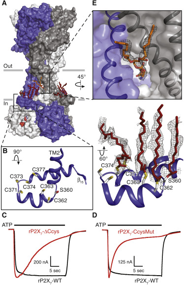 Figure 4. P2X7 Cytoplasmic Domain; the C-cys Anchor Is Palmitoylated to Modulate Receptor Function by Preventing Desensitization (A) Surface representation of the apo state of rP2X7, highlighting locations of the C-cys anchor and putative phospholipid binding site. (B) Left: the C-cys anchor is a loop containing six cysteine residues and one serine residue that each face toward the plasma membrane. Right: at least four cysteines (C362, C363, C374, and C377) and one serine (S360) on the C-cys anchor are palmitoylated. Palmitoylation of the C-cys anchor is also present in the open state reconstruction but more easily visualized in the higher-resolution apo state map. The higher-resolution apo state reconstruction also reveals that at least one cysteine (C4) in the N terminus is palmitoylated. Because of domain swapping within the context of a trimeric receptor, the N terminus of one protomer is adjacent to the C-cys anchor of an adjacent protomer, grouping together the palmitoylated moieties of different protomers and effectively interlocking them to the membrane. (C and D) Deletion (rP2X7-ΔCcys) of the C-cys anchor (C) or mutation of residues in the C-cys anchor to alanine (rP2X7-CcysMut) to prevent their palmitoylation (D) both result in channels that, when expressed in Xenopus oocytes, nearly completely desensitize during a 30-s application of 100 μM ATP (black bar). Wild-type rP2X7 receptor (rP2X7-WT) does not desensitize. (E) The putative phospholipid binding site, modeled as a PS, is near the middle of the plasma membrane. Each protomer is a different color. |