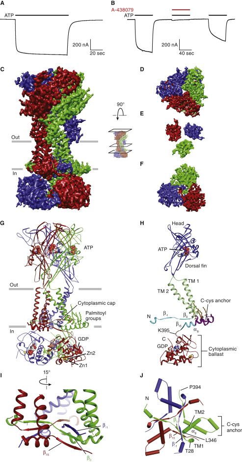 Figure S2. Functional Studies and the Overall Architecture of Full-Length rP2X7 in the Open State, Related to Figure 1 (A) ATP-induced rP2X7 currents (100 μM ATP, black bar) do not undergo desensitization. (B) Co-application of 10 μM antagonist A-438079 (red bar) inhibits the rP2X7 receptor current induced by 100 μM ATP (black bar). (C-F) The three-dimensional reconstruction of full-length rP2X7 in the ATP-bound, open state viewed parallel to the membrane as a side view (C), perpendicular to the membrane from the extracellular surface (D), from the center of the TM domain, toward the cytoplasm (E), and from the intracellular side of the membrane, toward the cytoplasm (F). (G) Ribbon representation of a trimeric receptor structure corresponding to the ATP-bound, open state reconstruction shown in (C). Each protomer is represented by a different color. (H) Ribbon representation of a single subunit of the open state structure, highlighting various purinergic receptor domains, including two new domains, the C-cys anchor and the cytoplasmic ballast. The major domains within a protomer are organized by color: extracellular domain in blue, TM domain in green, cytoplasmic cap in cyan, C-cys anchor in purple, and the cytoplasmic ballast in red. The palmitate groups are colored in sand. (I) A close-up side view of the cytoplasmic portion of the TM domain highlighting the interactions that form the cytoplasmic cap. The cytoplasmic cap is composed of domain-swapped β strands (β-1, β0, and β15) from each protomer. To improve visual clarity of the cytoplasmic cap, the C-cys anchor and cytoplasmic ballast have been removed. (J) Top-down cross-sectional view of the cytoplasmic cap looking toward the cytoplasm. Residues 29-345 and 395-595 of the receptor have been removed to improve visual clarity. Each protomer is a different color. |