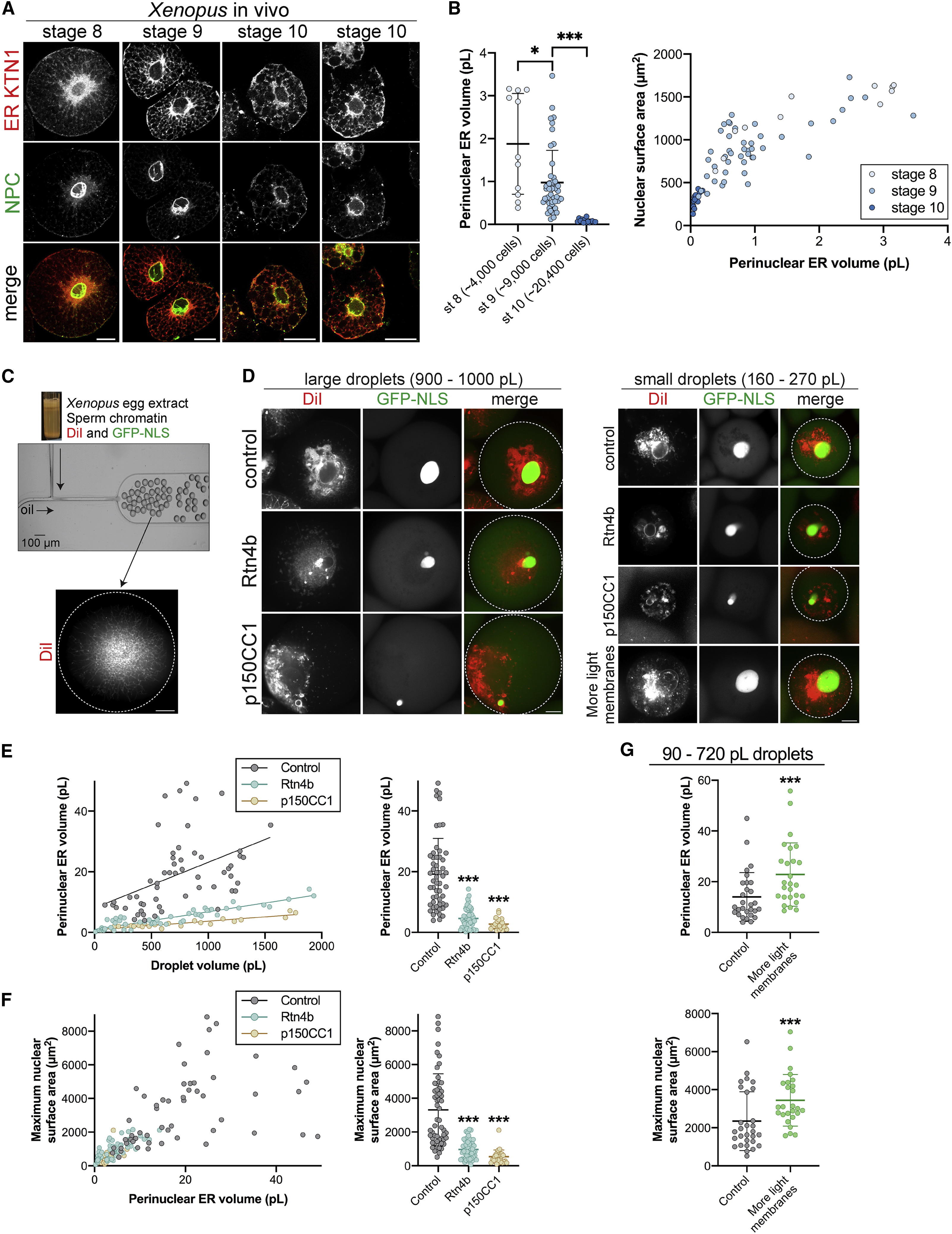 Figure 7. Perinuclear ER Volume Scales Nuclear Size In Vitro (A and B) Blastomeres from different stage Xenopus laevis embryos were dissociated, fixed, and stained with antibodies against perinuclear ER sheet marker KTN1 and the NPC (mAb414). (A) Representative confocal images are shown. (B) Perinuclear ER volume was quantified from confocal z stacks (see Figure S4C; STAR Methods). Nuclear surface area was extrapolated from CS area. Cumulative data are shown from three different batches of embryos. n = 11 (stage 8), n = 46 (stage 9), and n = 14 (stage 10). (CâG) Nucleus and ER formation were induced in fractionated interphase X. laevis egg extract supplemented with membrane dye DiI and GST-GFP-NLS protein. Extract and nuclei were encapsulated in droplets of differing volumes using microfluidic devices. Where indicated, extracts were supplemented with 67 nM recombinant Rtn4b protein, 3.2 μM recombinant p150CC1 dynein inhibitor, or 10% X. laevis light membranes. Confocal z stacks were acquired after a 3-h incubation at 16°C. n = 55 (control), n = 52 (Rtn4b), n = 27 (p150CC1), and n = 26 (more light membrane). (C) The experimental approach. The image of the microfluidic device was adapted with permission from Hazel et al. (2013). (D) Representative images of different sized droplets. Imaging of the droplet periphery verified that Rtn4b addition induced a more tubulated cortical ER (data not shown). The droplet boundary is outlined in white in the merged images. (E) Perinuclear ER volume was quantified from DiI images for different size droplets (see Figure S4C; STAR Methods). Previous studies have established that DiI stains ER membranes in Xenopus extract (Dreier and Rapoport, 2000). Correlation coefficients: 0.60 for control (p < 0.0001), 0.87 for Rtn4b (p < 0.0001), and 0.90 for p150CC1 (p < 0.0001). (F) Nuclear CS area was quantified from GFP-NLS images for different size droplets and extrapolated to surface area (see STAR Methods). For individual droplets, nuclear surface area was plotted as a function of the pER volume measured in (E). Correlation coefficient 0.88 for all data (p < 0.0001). (G) Perinuclear ER volume and nuclear surface area were quantified as in (E) and (F). Focusing on smaller droplets, a subset of the control data (90â710-pL droplets) is shown in comparison to the âmore light membranesâ data (110â720-pL droplets). Error bars represent SD. âââp < 0.005; âp < 0.05. Scale bars, 20 μm. See also Figure S6. |