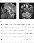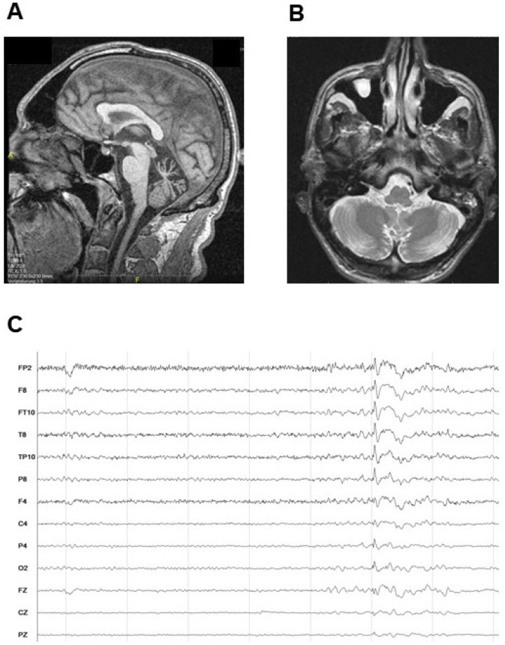 Figure 1. The patient presents with cerebellar atrophy and epilepsy. (A) Brain MRI section showing marked atrophy of the cerebellar vermis (T1-weighted image). (B) Brain MRI section showing slight atrophy of the cerebellar hemispheres (T2-weighted image). (C) Interictal EEG showing a frontotemporal spike, most prominent in the temporal leads (FT10, T8, TP10).