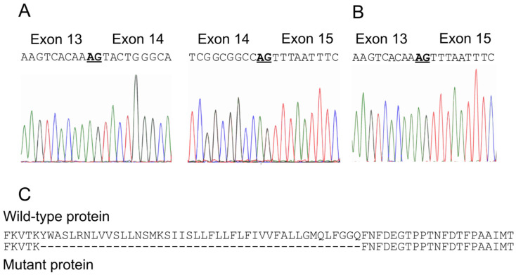 Figure 2. The patient carries a c.1913 + 2T > G variant in the CACNA1A gene. Sequencing chromatograms of a partial cDNA sequence of a healthy subject and the affected patient showing (A) exon 13/14 and exon 14/15, and (B) the abnormal junction (AG) between the exon 13 and 15 of the patient. (C) Alignment of the wild-type (top) and mutant (bottom) Cav2.1 protein showing the amino acid sequence that is predicted to be deleted (dashed line) as a consequence of the in-frame mutation.