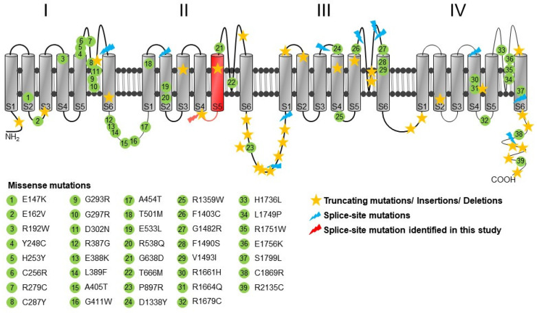 Figure 3. Localization of the identified splice-site mutation. Membrane topology of a Cav2.1 channel showing the predicted structure which includes four homologous domains (IâIV) with six transmembrane segments (S1âS6) in each domain. The position of the novel c.1913 + 2T > G variant is indicated as a red mark at the beginning of the S4âS5 linker of the II domain. Highlighted in red are shown the regions of the Cav2.1 channel that are predicted to be missed as a result of the mutation. The diagram also shows the localization of single nucleotide substitutions, truncating and splice-site mutations in the secondary structure of the Cav2.1α1 subunit. All CACNA1A missense, nonsense, and splice-site mutations that are depicted in the figure were collected from the HGMD database.