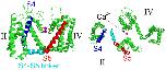 Figure 6. Structural modelling of Cav2.1 channels. Side view of the homology model of the domains II and IV of the alpha subunit (left). The front and back domains were removed for clarity. The crystal structure of the rabbit Cav1.1 alpha subunit (accession code: 5gjw) was used to show the corresponding structures that are affected by the mutation identified in the patientâs Cav2.1 channel. The relevant helices are highlighted using different colors: S4 (blue), S4âS5 linker (cyan), and S5 (red). On the right-hand side is the top view of the channel to further show the structural and functional relationships between the S4âS5 linker and the voltage-sensor S4, as well as the S5 and the ion conducting pore. The magenta spheres represent the Ca2+ ions located within the selectivity filter. Roman numbers mark the corresponding domains.