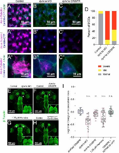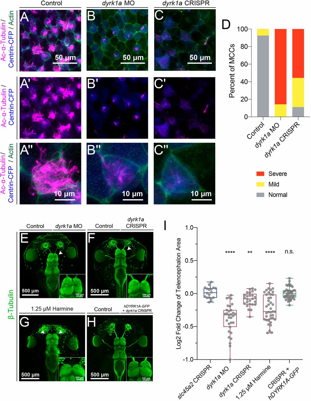 dyrk1a is required for ciliogenesis and brain size. (A-Câ²) Stage 35 X. tropicalis embryonic epidermis stained for acetylated α-Tubulin (cilia, magenta), phalloidin (actin, green) and expressing Centrin-CFP (basal bodies, blue). Injection of dyrk1a morpholino (MO) (B-Bâ²) or CRISPR/Cas9 reagents (C-Câ²) causes a loss in cilia (magenta) compared with the injected control (A-Aâ²). See also Figs S2, S3. (D) Quantification of ciliogenesis phenotype (severe, mild and normal) in multiciliated cells (MCCs) by condition. n>35 for each condition. (E-H) Dorsal view of β-Tubulin antibody staining (green) of X. tropicalis tadpoles, injected (right side) with dyrk1a morpholino (MO) (E) or dyrk1a CRISPR (F), or co-injected with dyrk1a CRISPR and human GFP-tagged DYRK1A (hDYRK1A-GFP) (H). (G) Dyrk1a kinase inhibitor harmine-treated embryos are affected bilaterally (1.25â
