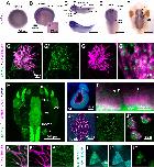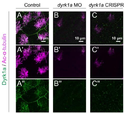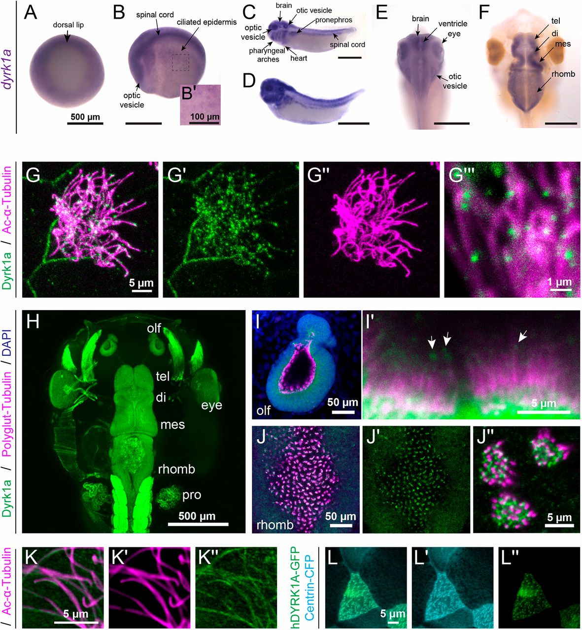 µm in Bâ². (G-Gâ´) Embryonic epidermis antibody staining for Dyrk1a protein (green) shows puncta along ciliary axonemes labeled for acetylated α-Tubulin (Ac-α-Tubulin, magenta). See Fig. S1 for antibody validation. (H) Dorsal view of whole-mount antibody staining showing Dyrk1a (green) throughout the nervous system and in the pronephros (pro). (I-Jâ²) Dyrk1a (green) is on cilia marked by polyglutamylated-Tubulin (polyglut-Tubulin, magenta) in the olfactory epithelium (olf, I,Iâ²) and in the rhombencephalon (J-Jâ²). White arrows (Iâ²) indicate the puncta of Dyrk1a (green) on cilia. There is also strong membrane staining. (K-Kâ²) Human GFP-tagged DYRK1A (hDYRK1A-GFP, green) localizes in puncta along ciliary axonemes labeled for acetylated α-Tubulin (magenta). (L-Lâ²) hDYRK1A-GFP (green) colocalizes with Centrin-CFP (cyan) at basal bodies. |