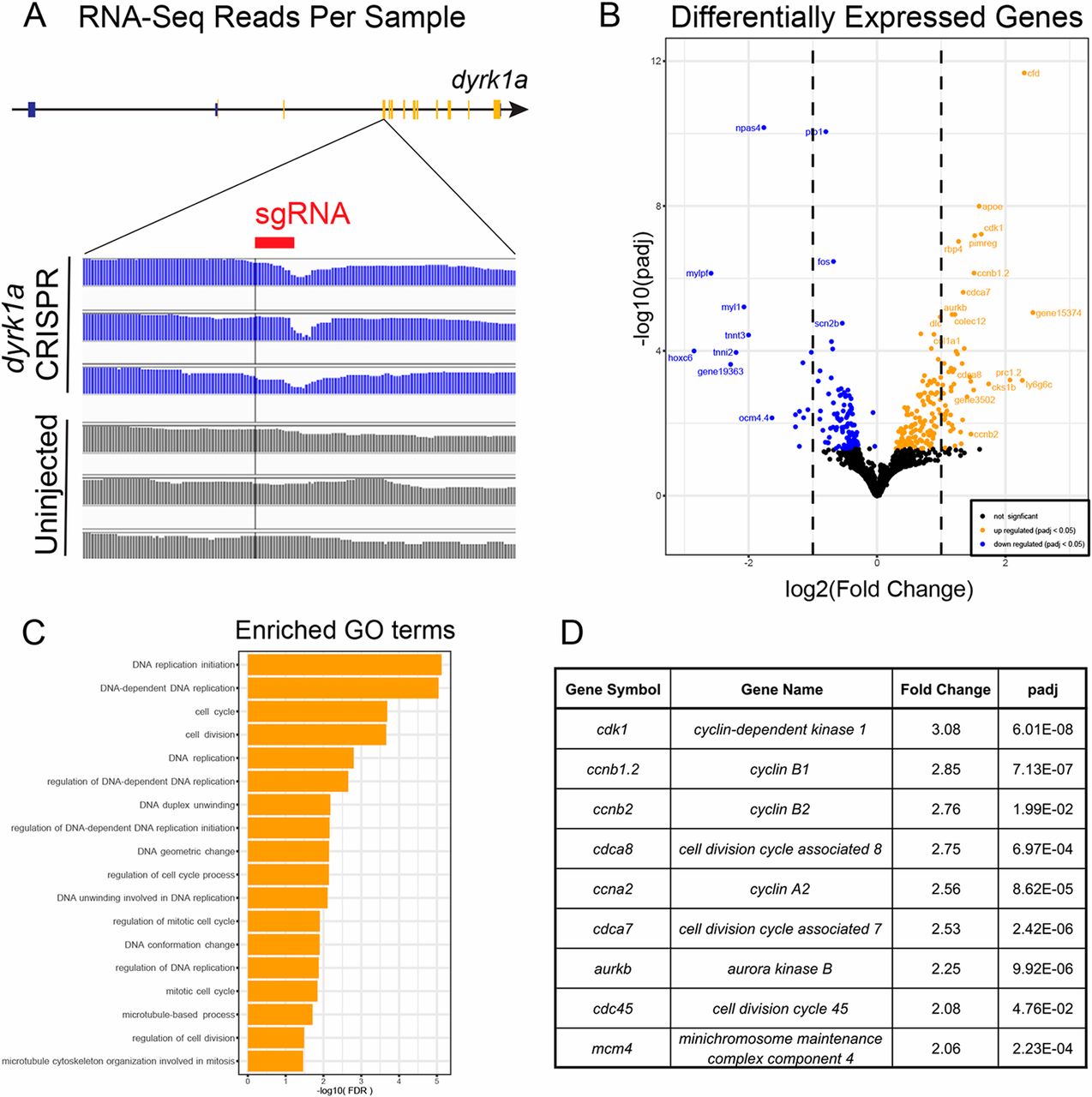 RNA-sequencing implicates cell cycle control in the dyrk1a brain phenotype. (A) RNA-sequencing reads of uninjected control and dyrk1a CRISPR samples. These were from dissected stage 46 brains. Sequencing reads (blue) are lost adjacent to the sgRNA target site (red) in the injected samples but not the uninjected samples within the targeted exon of dyrk1a. (B) Volcano plot of differentially expressed genes (DEGs) following dyrk1a mutation with fold change and adjusted P-value in log scales on the x- and y-axes. Upregulated (orange) and downregulated (blue) DEGs with P<0.05 are shown. (C) Enriched gene ontology (GO) terms of DEGs by false discovery rate (FDR). (D) A list of selected DEGs with high fold change and high significance related to cell cycle control. |