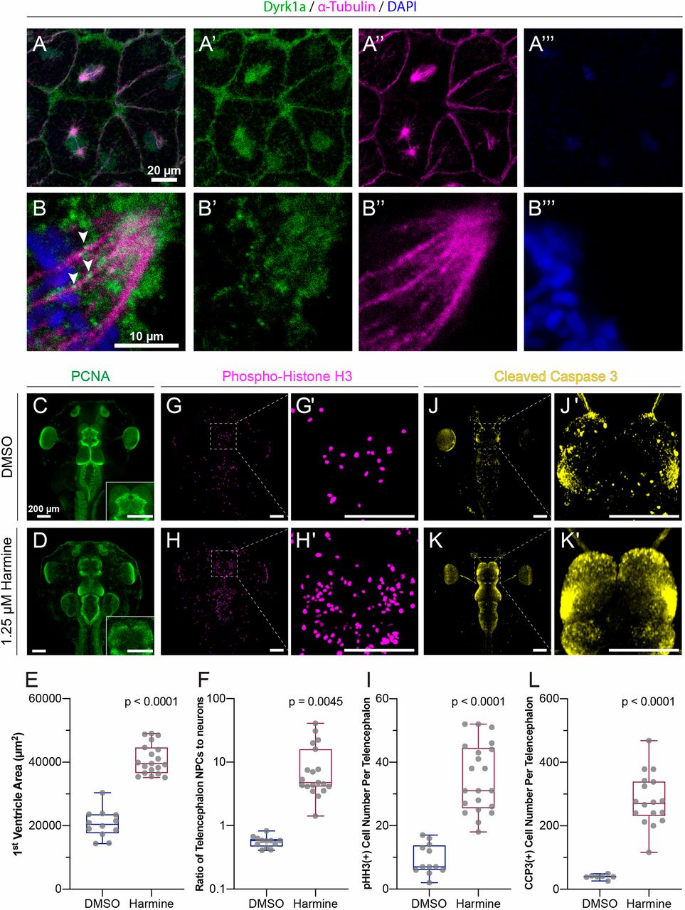 µM Dyrk1a inhibitor harmine (bottom row). (C,D) Antibody staining for PCNA (proliferating cell nuclear antigen, S-phase marker, green). Telencephalon region is shown in the inset. (E) Quantification of first ventricle area using PCNA staining. (F) Quantification of the ratio of neural progenitor cells (NPCs, PCNA area) to the area of differentiated neurons in each telencephalon (log scale). (G,H) Antibody staining for pHH3 (phospho-histone H3, M-phase marker, magenta). (Gâ²,Hâ²) High-magnification views of telencephalon regions from G and H. (I) Quantification of pHH3-positive cell number per telencephalon. See also Fig. S4. (J,K) Antibody staining for CCP3 (cleaved caspase 3, cell death marker, yellow). (Jâ²,Kâ²) High-magnification view of telencephalon from J and K. (L) Quantification of CCP3-positive cell number per telencephalon. Scale bars: 200â