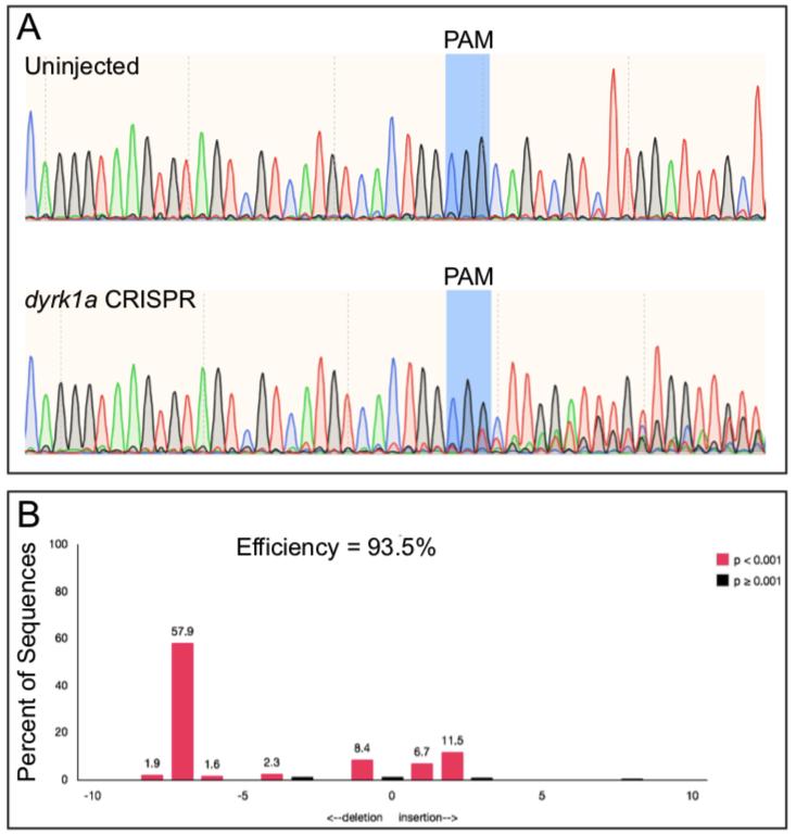 (A) Examples of Sanger sequencing traces from PCR products amplifying the region surrounding the protospacer adjacent motif (PAM) within the dyrk1a coding sequence for uninjected control and dyrk1a CRISPR/Cas9 bilaterally injected embryos. Note the drop-off in sequence quality following the PAM, indicating insertions and/or deletions. (B) Example of tracking of INDELs (TIDE) analysis from the injected animal in (A), where Sanger sequencing traces are deconvolved to determine frequency and position of induced variants. For this sample, mutational efficiency is 93.5%, and the frequency and position of insertion and deletion frequency are shown as a histogram. For this sample, the most common sequence was a -7 base pair deletion (57.9% of sequences). |