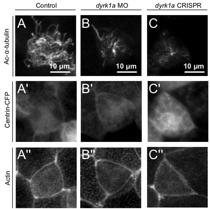 (A-C) Separated channels in grayscale from stage 35 X. tropicalis embryonic epidermis from Fig. 2. Injection of dyrk1a morpholino (MO) (B) or CRISPR/Cas9 reagents (C) causes defects in ciliogenesis compared to the injected control (A). |