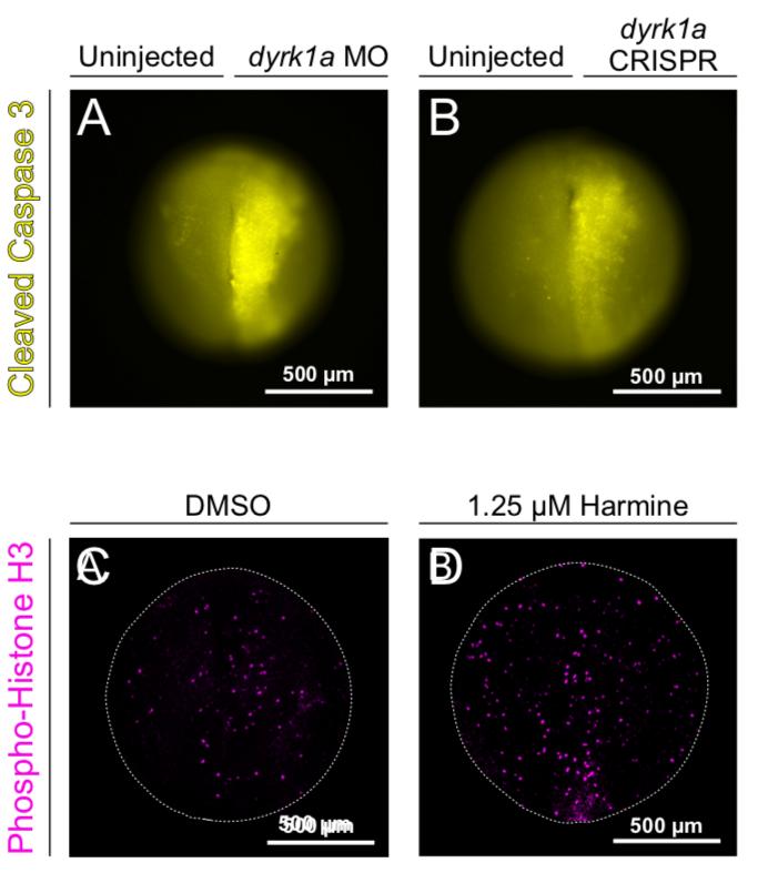 Figure S4: Loss of dyrk1a increases cleaved caspase 3 and phospho-histone H3 staining. (A-B) Representative images of cleaved caspase 3 (yellow) staining of X. tropicalis neurula stage embryos injected only on the right side with dyrk1a morpholino (MO) (A) or dyrk1a CRISPR/Cas9 reagents (B). (C-D) Representative images of phospho-histone H3 (magenta) staining of X. tropicalis neurula stage embryos treated with DMSO (C) or 10 μM Harmine (D) beginning at blastula stages. Outlines of the embryos are shown in white dashed lines (C-D). All images are dorsal view with the anterior oriented to the top, and maximum intensity projections of optical sections. All conditions have a sample size greater than 20. |