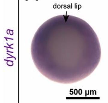 dyrk1a (dual specificity tyrosine-(Y)-phosphorylation regulated kinase 1A) gene expression in a Xenopus tropicalis embryo, assayed via in situ hybridization, NF stage 10.5, vegetal view, dorsal up. |