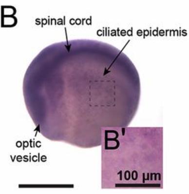Expression and localization of Dyrk1a during X. tropicalis development. (A-F) RNA in situ hybridization in X. tropicalis. (A-Bâ²) dyrk1a is expressed during gastrulation (stage 10.5, A) and at stage 20 (B) in the brain, spinal cord, optic vesicles and ciliated epidermis (Bâ²). (C,D) At stages 32 (C) and 35 (D), dyrk1a is expressed in the brain, spinal cord, otic vesicles, optic vesicles, pharyngeal arches, heart, epidermis and pronephros. (E,F) At stages 40 (E) and 46 (F), dyrk1a is expressed in the brain, especially along ventricles [telencephalon (tel), diencephalon (di), mesencephalon (mes) and rhombencephalon (rhomb)]. Scale bars: 500â