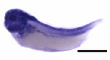 dyrk1a (dual specificity tyrosine-(Y)-phosphorylation regulated kinase 1A) gene expression in a Xenopus tropicalis embryo, assayed via in situ hybridization, NF stage 20, lateral view, anterior left, dorsal up. |
