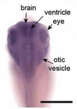 dyrk1a (dual specificity tyrosine-(Y)-phosphorylation regulated kinase 1A) gene expression in a Xenopus tropicalis embryo, assayed via in situ hybridization, NF stage 40, dorsal view, anterior up. |
