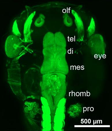 Key: olf: olfactory epithelia, tel: telencephalon, di: diencephalon, mes: mesencephalon/midbrain, rhomb: rhombencephalon/hindbrain, pro: pronephric kidney, eye: eye. |