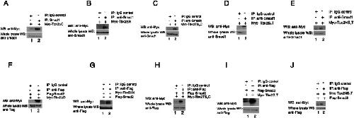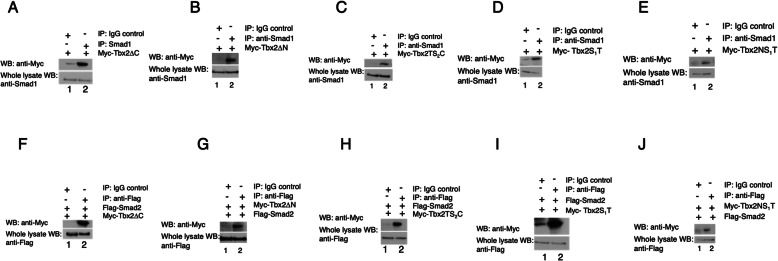 Fig. 4. The Tbx2 Spacer 1 and T-box domains are sufficient for R-Smad association. a-e Smad1 physically associates with Tbx2 via the T-box. Embryos were injected at the two-cell stage with 1âng of RNA synthesized from the indicated deletion construct. Pull-down of native Smad1 from injected embryos leads to co-immunoprecipitation of the exogenous deletion construct. Normal rabbit IgG antibodies were used in parallel studies as a negative control. f-j Smad2 physically associates with Tbx2 via the T-box. Embryos were injected at the two-cell stage with 1âng of RNA synthesized from the indicated deletion construct and flag-smad2. Pull-down of Flag-Smad2 from injected embryos leads to co-immunoprecipitation of the exogenous deletion construct. Normal rabbit IgG antibodies were used in parallel studies as a negative control