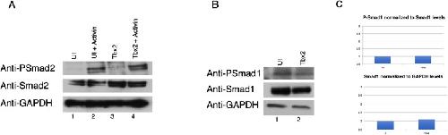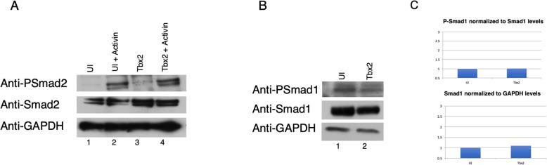 Fig. 6. Tbx2 does not decrease levels of C-terminal phosphorylation of Smad1 and Smad2 a) Embryos were injected with 1âng tbx2 at the two-cell stage; animal caps were explanted at stage 8.5 and incubated in Activin (2.5âng/ml), as indicated, until late gastrula stages. Uninjected embryos were used in parallel studies. b Embryos were injected with 1âng tbx2 at the two-cell stage and animal caps were explanted at stage 8.5 and incubated until late gastrula stages. Uninjected embryos were used in parallel studies. c Quantification of data shown in B, indicating no change in Smad1 protein levels or phosphorylation of Smad1 as a result of ectopic tbx2 expression