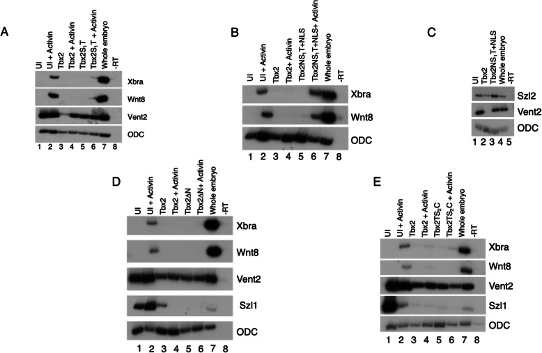 Fig. 5. Effects of Tbx2 deletion constructs on the BMP/GDF and Activin/Nodal pathways a) Embryos were injected with 2âng of tbx2 or tbx2S1T in the animal pole at the two-cell stage. Animal caps were explanted at stage 8.5. Activin was added (2.5âng/ml) as indicated. b Embryos were injected with 2âng of tbx2 or tbx2NS1T in the animal pole at the two-cell stage. Animal caps were explanted at stage 8.5. Activin was added (2.5âng/ml) as indicated. c Embryos were injected with 2âng of tbx2 or tbx2NS1T in the animal pole at the two-cell stage. Animal caps were explanted at stage 8.5. d Embryos were injected with 1âng tbx2 or tbx2ÎN in the animal pole at the two-cell stage. Animal caps were explanted at stage 8.5. Activin was added (2.5âng/ml) as indicated e) Embryos were injected with 1âng tbx2 or tbx2TS2C in the animal pole at the two-cell stage. Animal caps were explanted at stage 8.5. Activin was added (2.5âng/ml) as indicated