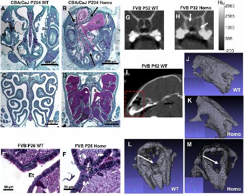 Fig 2. Camsap3tm1a/tm1a mice have obstructed nasal cavities and abnormal nasal cavity structure. (AâD) Mucin blocks the nasal airway and obstructs the olfactory epithelium in older Camsap3tm1a/tm1a mice. PAS staining for glycoproteins in coronal nasal sections in WT (A) showing a patent anterior nasal airway (A) with a central bony septum at the level of the vomeronasal organ compared with mucin buildup (B) (purple) in Camsap3tm1a/tm1a with a deviated septum (arrows). WT (C) patent nasal airway with a central septum at a level where the ethmoid turbinates (T) are covered primarily with olfactory sensory epithelium compared with Camsap3tm1a/tm1a (D) with almost total airway (a) blockage with mucin (purple). (Scale bars, 500 µm.) (EâH) Mucin blocks the nasal airway of young adult Camsap3tm1a/tm1a mice. PAS staining shows a normal opening to the Eustachian tube (Et) in WT mouse (E), while its Camsap3tm1a/tm1a littermate exhibited mucin accumulation (m) and folding of epithelial cell layers (white arrows) in the Eustachian tube (F). (Scale bars, 50 µm.) Micro-CT images showing dark and radiopaque regions at the back of the nasal cavity in WT (G) and Camsap3tm1a/tm1a (H), respectively. White arrows indicate blockage. A calibration bar is as indicated. Hu, Hounsfield units. (IâM) Representative rendered 3D images obtained by thresholding of CT data in WT and Camsap3tm1a/tm1a are shown. Snout details from the region outlined in red in I are shown for different orientations for WT (J and L) and Camsap3tm1a/tm1a (K and M) mice. An orientation axis for each figure is shown in the corresponding inset. The white arrows in (L) and (M) point at the snout region with most structural differences between the WT and Camsap3tm1a/tm1amouse.