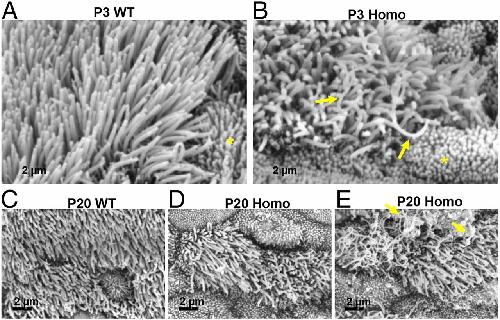 Fig. 3. MCCs from Camsap3tm1a/tm1a have abnormal ciliary morphology. SEM images of nasal MCCs from WT (A and C) and its Camsap3tm1a/tm1a littermate (B, D, and E) at P3 and 20. Arrows in B point to long and curved cilia in Camsap3tm1a/tm1a mice. Nearby microvilli are indicated by asterisks. (E) The surface of MCCs from a Camsap3tm1a/tm1a at P20. Yellow arrows indicate the layer of fibrous substances. (Scale bars, 2 µm.)