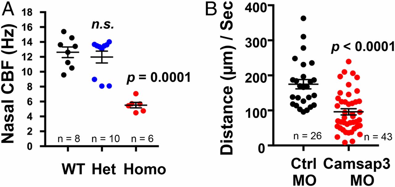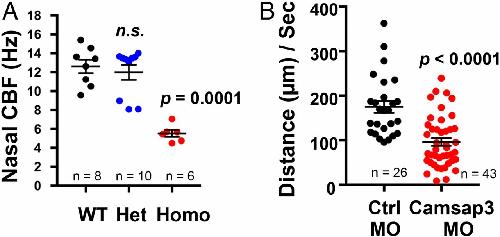 Reduction of CAMSAP3 causes impaired mucociliary transport. (A) Nasal ciliary beat frequency in hertz (beats per second) for motile cilia of nasal tissues at age P3 versus genotype. Replicates (n) are as indicated. (B) Velocity of fluorescent beads in micrometers per second of control (Ctrl) Xenopus embryos injected with morpholinos versus Camsap3 morpholino-injected embryos. n, number of fluorescent beads.