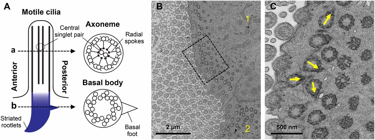 Fig. 6. Reduction of CAMSAP3 expression in mice disrupts the polarity of basal bodies in MCCs. (A) Motile cilium structure. (B) A representative image showing disorientated basal feet found in two MCCs (indicated with numbers 1 and 2) in the nasal cavity of Camsap3tm1a/tm1a (P30). (Scale bar, 2 µm.) (C) High-magnification image of the boxed region in B. Yellow arrows indicate basal feet with various orientations. (Scale bar, 500 nm.)