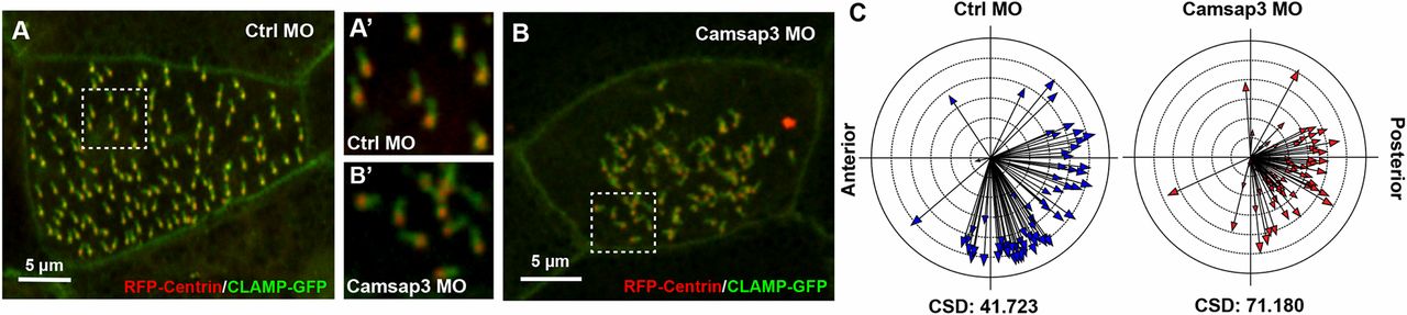 Fig. 7. Reduction of CAMSAP3 expression disrupts the polarity of basal bodies in MCCs of Xenopus embryos. Confocal images of Xenopus embryos injected with RNAs for RFP-centrin and CLAMP-GFP together with either control- (A) or Camsap3-MO (B). Boxed regions from A and B are shown in Aâ² and Bâ², respectively. (Scale bars, 5 µm.) (C) Quantification of MCC polarity. Each arrow represents the mean cilia orientation for a given cell, while arrow length represents 1/r, namely the variation in orientation within the cell (long arrows indicate low variation and short arrows indicate high variation).