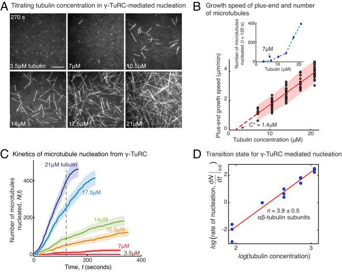Figure 2. Molecular composition of transition state in γ-TuRC-mediated nucleation.(A) Titrating tubulin concentration with constant the density of γ-TuRC. MT nucleation from γ-TuRC begins at 7μM tubulin. (B) MT plus-end growth speed increases linearly with tubulin concentration. Individual data points are plotted, and linear fit (red line) with shaded mean±2std (95% confidence interval) is displayed. Critical concentration for polymerization as C* = 1.4 μM. Inset: Number of MTs nucleated by γ-TuRCs within 120 s varies non-linearly with tubulin concentration. (C) Number of MTs nucleated (N(t)) over time (t) is plotted for varying tubulin concentration to obtain rate of nucleation as the slope of the initial part of the curves. Shaded regions represent 95% confidence interval (n±2n) in the number of nucleated MTs (n) assuming a Poisson distribution as described in Materials and methods. (D) Number of tubulin dimers (n) in the critical nucleus on γ-TuRC was obtained as 3.9±0.5 from the equation dNdt|tâ0=kCtubn displayed on a log-log axis as detailed in Materials and methods. The rate of nucleation at 10.5 μM was set to 1 to normalize differences in γ-TuRC concentration from individual experiments. The experiments and analyses in (AâD) were repeated identically three times with independent γ-TuRC preparations. MT nucleation data, prior to normalization, from one representative dataset is displayed in (BâC). Analyses from all repeats was pooled and normalized as described above, and data points from 15 nucleation-time curves are plotted in (D). See Video 3.Figure 2âsource data 1. Source data for Figure 2BâD.Each excel sheet is labelled with individual figure panel. For Figure 2C, all three experimental replicates are supplied, and dataset one is plotted. |