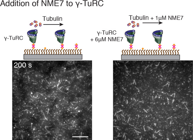 Figure 6—figure supplement 1. Effect of putative activation factor NME7 on γ-TuRC-mediated nucleation.(A) A constant density of γ-TuRC molecules were attached without (left) and with (right) 6 μM NME7 and 10.5 μM tubulin ±1 μM additional NME7 was added. Experiments were repeated twice on different experimental days with the same γ-TuRC preparation. See also Figure 6 and Video 6. |