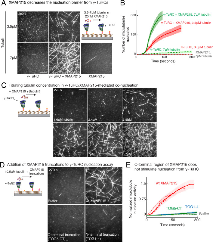 Figure 7—figure supplement 1. Role of XMAP215 on γ-TuRC-mediated microtubule nucleation.(A) γ-TuRCs were attached and 3.5-7μM tubulin ± 20nM XMAP215-GFP was added. Experiment was repeated identically two times with independent γ-TuRC purifications. One additional replicated was performed with 7μM tubulin. (B) Number of MTs nucleated (N(t)) over time (t) is plotted and shaded regions represent 95% confidence interval (n±2n) in the number of nucleated MTs (n) assuming a Poisson distribution as described in Materials and methods. Analyses were repeated twice with independent γ-TuRC purifications, and representative dataset is reported to highlight the absolute increase in the number of MTs nucleated by XMAP215. One additional supporting replicate was obtained only at 7 μM tubulin. (C) Titrating tubulin with constant γ-TuRC and XMAP215 concentration. XMAP215/γ-TuRC molecules were observed to nucleate MTs at low tubulin concentrations of 1.6-3.5 μM. Experiments were repeated at three times with independent γ-TuRC preparations, and fewer concentration points were repeated another two times. (D) The role of C-terminal region of XMAP215 or N-terminal region was tested in the cooperative nucleation with purified γ-TuRC. MTs nucleated by γ-TuRC alone (top-left panel), γ-TuRC with 20nM full-length XMAP215 (top-right panel), γ-TuRC with 20 nM C-terminal domain containing TOG5 and C-terminus of XMAP215 (bottom-left panel), or γ-TuRC with 20 nM N-terminal domain containing TOG1-4 domains (bottom-right). While the N-terminus is not sufficient for MT nucleation, C-terminal domain of XMAP215, which binds γ-TuRC directly, also does not stimulate MT nucleation from γ-TuRC. (E) MT nucleation was measured, and number of MTs nucleated with wild-type XMAP215 reactions at 150 s was set to 1 to account for variable γ-TuRC concentration across purifications. Individual dataset with ±wt XMAP215, TOG5-CT or TOG1-4 are reported with solid, dashed or dotted curves. The number of times the experiment in (D–E) was repeated independent γ-TuRC preparations is as follows: buffer (3), wild-type XMAP215 (3), TOG1-4 (2), TOG5-CT (2). All data were pooled and reported in (E). Shaded regions represent 95% confidence interval (n±2n) in the number of nucleated MTs (n) assuming a Poisson distribution as described in Materials and methods. Scale bars, 10 μm. See also Figure 7 and Videos 7, 8. |