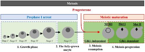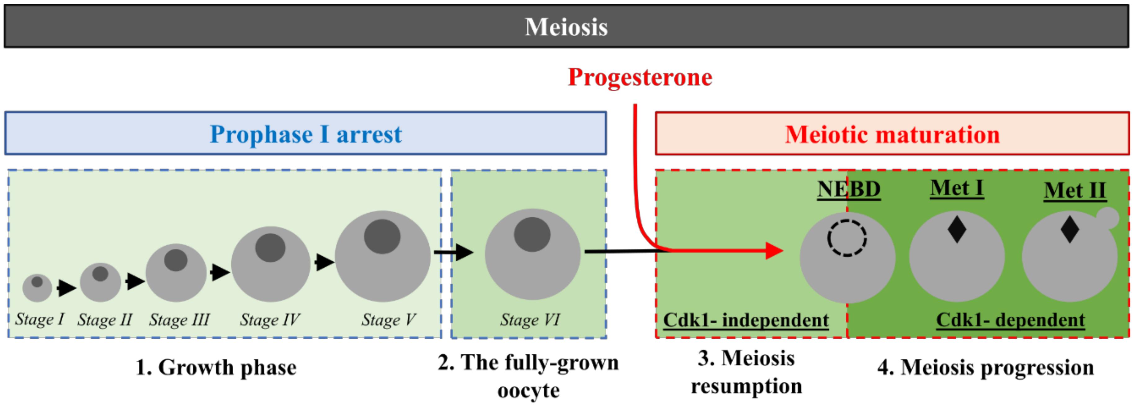 Figure 1. Four phases of Xenopus oocyte meiosis. (1) The growth period: Oocytes enter prophase of the first meiotic division and arrest at the diplotene stage (Prophase I). Growing oocytes have been classified into six stages by Dumont [31]. (2) The fully-grown oocyte: when oocyte growth is complete, transcription and vitellogenesis stop, and oocytes become competent to undergo meiotic maturation. (3) Meiosis resumption: Progesterone releases the prophase arrest and oocytes resume meiosis. (4) Meiosis progression: Following nuclear envelope breakdown (NEBD), oocytes assemble the metaphase I (Met I) spindle. After anaphase I, the first polar body is extruded, and a metaphase II (Met II) spindle assembles. |