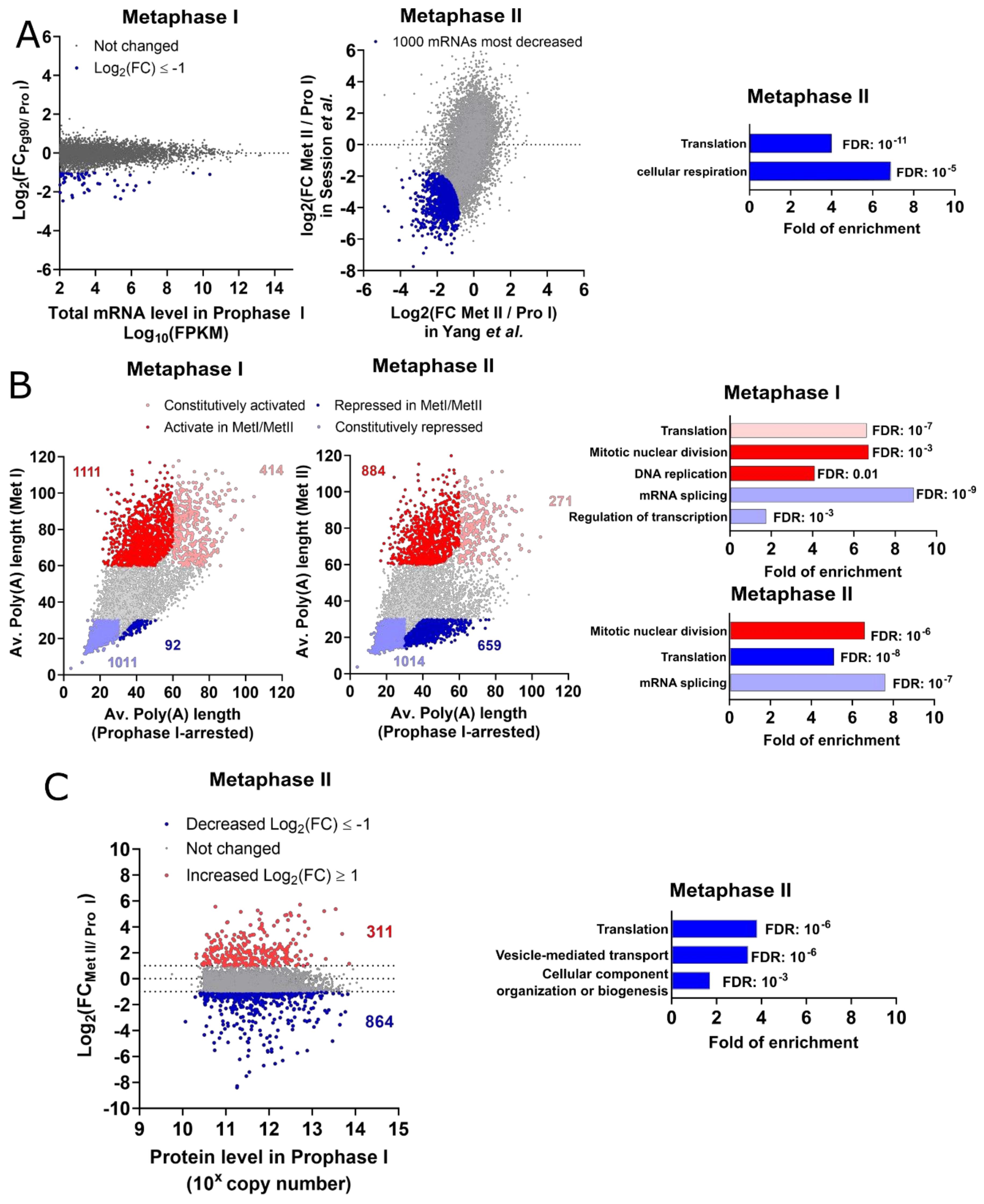 Figure 4. Genome-wide analysis of oocytes during meiotic maturation. (A) Changes in total mRNA levels [37,72]. Left panel: Changes between prophase I and metaphase I oocytes. Blue: mRNAs, whose level decreases more than 2-fold. Middle panel: Changes between prophase I (Pro I) and metaphase II (Met II) oocytes. The average rank is used to highlight the 1000 transcripts whose levels decrease the most during this period of meiotic maturation (blue). Right panel: Selection of the gene ontology terms enriched among the 1000 mRNAs from the middle panel. (B) Changes in the poly(A) tail length of each mRNA during meiotic maturation [72]. A color-code depicts 4 groups of transcripts. Light red: constitutively activated transcripts with poly(A) tail ⥠60 nt at all periods; dark red: activated mRNAs whose poly(A) tail increases, at least, by 10 nt and is longer than 60 nt in Met I/Met II; light blue: constitutively repressed mRNAs with poly(A) tail ⤠30 nt at all periods; dark blue: repressed mRNAs whose poly(A) tail decreases more than 10 nt and is shorter than 30 nt in Met I/Met II. Left panel: Changes between prophase I and metaphase I (Met I) oocytes. Middle panel: Changes between prophase I and metaphase II (Met II) oocytes. Right panel: Selection of the gene ontology terms enriched among the 4 groups of transcripts. (C) Left panel: Changes in the protein levels between prophase I and metaphase II oocytes [70]. The proteins whose copy number increases or decreases more than 2-fold are colored in red or blue, respectively. Right panel: Selection of the gene ontology terms enriched among the proteins whose level decreases more than 2-fold, from the right panel. |