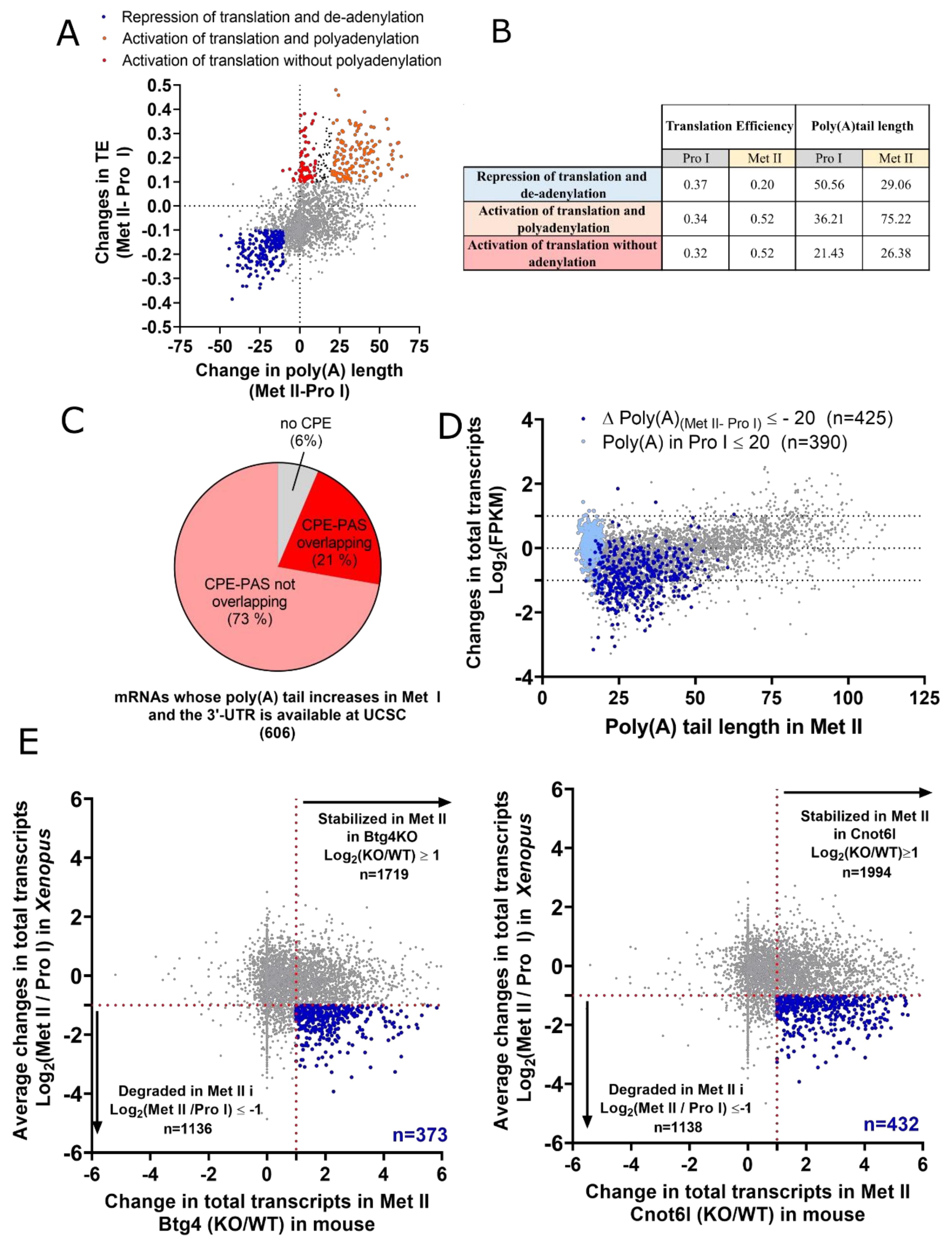 Figure 5. The relationship between poly(A) tail length, translation, and mRNA degradation. (A) Changes in translation efficiency (TE) and in the poly(A) tail length between fully-grown prophase (Pro I) and metaphase II (Met II) oocytes [72]. Transcripts are divided into three groups: transcripts whose poly(A) tail decreases, at least, by 10 nt and TE decreases, at least, by 0.1 (blueârepression of translation and de-adenylation), transcripts whose poly(A) tail increases less than 10 nt and TE increases more than 0.1 (redâactivation of translation without polyadenylation), and mRNAs whose poly(A) tail increases more than 20 nt and TE increases, at least, by 0.1 (orangeâactivation of translation and polyadenylation). (B) Median values of translation efficiency and poly(A) tail length of the three groups described in panel A. (C) 3â²-UTRs of the mRNAs whose poly(A) tail increases, at least, by 10 nt and is longer than 60 nt in metaphase I (Met I) oocytes are retrieved from the UCSC database. Sequences of cytoplasmic polyadenylation elements (CPEs) and CPE overlapping the PAS from Pique et al. [92] are searched within the 3â²-UTRs. The pie chart represents the percentage of transcripts containing at least one CPE or one CPE overlapping the PAS or none. (D) Changes in total mRNA levels between fully-grown prophase (Pro I) and metaphase II (Met II) oocytes are compared to the length of the poly(A) tail in Met II oocytes [72]. A color-code depicts two groups. Light blue: mRNAs with a poly(A) tail length ⤠20 in both Pro I and Met II oocytes; dark blue: mRNAs whose poly(A) tail length decreases, at least, by 20 nt between both stages. (E) Changes in the total mRNA levels between fully-grown prophase I (Pro I) and metaphase II (Met II) in Xenopus oocytes [72] are compared with mRNAs that are stabilized in btg4 (left panel) or cnot6l (right panel) knockout mouse Met II oocytes [114]. Blue: transcripts degraded in Xenopus Met II oocytes and stabilized in btg4 (left panel) or cnot6l (right panel) knock-out mouse Met II oocytes. |