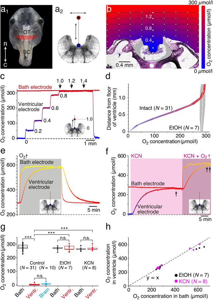 Fig. 1. Measurements of O2 levels in isolated preparations. a, b Photomicrograph, depicting an isolated head of a stage 53 tadpole (a1), a schematic transverse section of the hindbrain (a2), and a cross-sectioned head (b) at a rostro-caudal level indicated by the trapezoid in a1; red and blue circles and arrows in a2 indicate movements of the O2 electrode within the grid (white dots in b), used to construct the O2 profile (b). c Dual recordings of O2 concentrations in the bath and above the floor of the IVth ventricle in steps of 0.2âmm. d O2-concentration profile (meanâ±âSEM) of a midline depth track above the IVth ventricle (a2) in control (intact; color-coded) and metabolically inactive (EtOH-fixated; gray) preparations. e, f Recording of the ventricular O2 concentration in an EtOH-fixated preparation (e) during temporary increase of the bath O2 level to 650âμmol/l (gray area), and of an intact preparation (f) after bath-application of KCN (light pink area; 500âμmol/l); note that KCN causes an adjustment of the ventricular O2 level to the bath O2 level (single arrow in f) that remains matched (double arrow in f) when the bath O2 level is further increased (dark pink area). g Boxplot, depicting O2 concentrations in air-saturated bath solution (black), at the ventricular floor (red), and within the hindbrain (blue) in controls, in EtOH-fixated and KCN-treated preparations; note that EtOH-fixation and bath-application of KCN cause a significant increase of ventricular O2 concentrations to bath Ringer levels (***pâ<â0.0001; Mann-Whitney U test). h Scatter plot depicting coinciding ventricular and bath O2 levels in metabolically inactive (black dots, EtOH-fixated) or oxidative phosphorylation-impaired (pink dots, KCN) preparations. O2 levels in bâf are color-coded from blue (0âμmol/l) to red (300âμmol/l) to yellow (600âμmol/l); transverse hindbrain schemes indicate motion (c) or position (e, f) of the O2 electrode. OT, optic tectum; R, rostral; C, caudal; SC, spinal cord; N, number of preparations