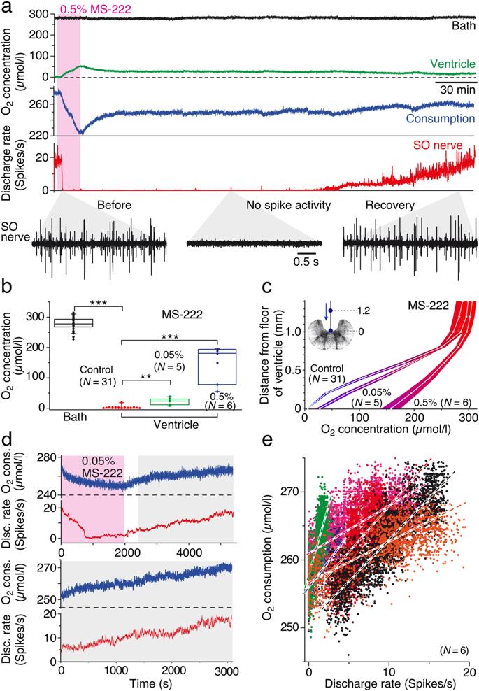 Fig. 3. Correlation between neuronal discharge and ventricular O2 concentration. a Recording of O2 levels in the bath (top black trace) and ventricle (green trace) along with the resting rate (red trace) of superior oblique nervespike activity illustrated at extended time scales (black traces) for selected periods before (before), after spiking has been blocked by bath-applied (0.5%; pink area) MS-222 (no spike activity), and during recovery (recovery); the O2 consumption (blue trace) was calculated as the difference of concurrent bath and ventricular O2 concentrations. b Boxplot, depicting O2 concentrations in the bath (black) and ventricle in controls (red; Nâ=â31) and after bath-application of 0.05% (green; Nâ=â5) and 0.5% MS-222 (blue; Nâ=â6) indicating significantly increased ventricular O2 levels when the spike activity was blocked (**pâ<â0.001; ***pâ<â0.0001; Mann-Whitney U test. c O2 concentration profile (meanâ±âSEM) of a midline depth track above the floor of the IVth ventricle in controls and after bath-application of 0.05% and 0.5% MS-222. d O2 consumption (upper blue trace), calculated from O2 concentrations of the bath Ringer and ventricle and corresponding superior oblique nerve discharge rate (upper red trace) during and after bath application of 0.05% MS-222 (pink area); lower traces illustrate the O2 consumption (blue) and resting rate (red) during the recovery from the drug effect at an extended time and amplitude scale (gray area from above). e Scatter plot, depicting the dependency of calculated O2 consumption on the resting rate of the superior oblique nerve during recovery from a 0.5% MS-222-induced block of spike activity (Nâ=â6); data from individual preparations are color-coded; each linear regression line has a slope that is significantly different from zero (pâ<â0.0001); green (r2â=â0.52), blue (r2â=â0.42), red (r2â=â0.40), black (r2â=â0.71), pink (r2â=â0.55), and orange (r2â=â0.69). N, number of preparations