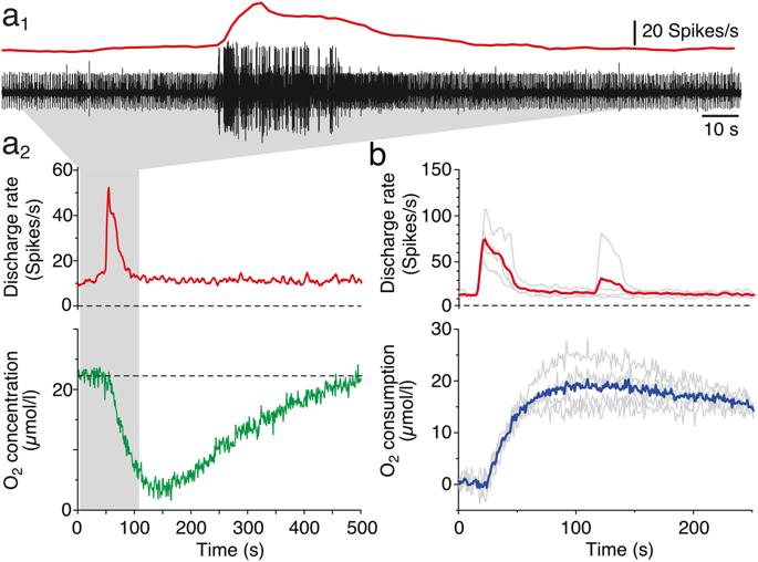 Fig. 4. Decrease of ventricular O2 concentrations during spontaneous spike bursts. a Typical multi-unit recording of the superior oblique nerve (black trace) and corresponding firing rate (red trace; bin width 1âs), depicting a spontaneously occurring spike burst (a1). a2 shows the transiently elevated discharge rate (red trace) of the multi-unit spike activity in a1 (gray area) and concurrent alteration in ventricular O2 concentration (green trace) in an air-saturated bath solution. b Overlay of four consecutive spike burst episodes in an individual preparation (gray traces in the upper plot) and concurrent increases in ventricular O2 consumption (gray traces in the lower plot) along with the respective averages (red and blue traces)