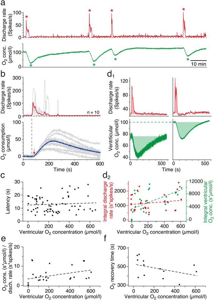 Fig. 5. Systematic correlation between neuronal activity and ventricular O2 levels. a Superior oblique nerve firing rate profile (red trace) of four successive spike bursts (red *) and concurrent alterations of the ventricular O2 concentration (green trace and *) at a ventricular O2 level of ~â100âμmol/l. b Overlay of spike burst episodes (nâ=â10) from one preparation and corresponding increases in ventricular O2 consumption (gray traces in the upper and lower plot) along with the respective averages (red and blue traces); vertical dashed line and red arrow indicate the latency of the O2 transient relative to spike burst onset. c Latency of O2 transients (nâ=â69 from 10 preparations) as function of ventricular O2 concentrations; the slope of the linear regression was not significantly different from zero (r2â=â0.004; pâ=â0.61). d Integrals of spike bursts and concurrent O2 transients (light red and light green areas in d1, respectively) at a lower (left in d1) and a higher ventricular O2 level (right in d1; green dashed line); d2 shows the dependency of spike burst (red circles) and O2 transient integrals (green circles) on ventricular O2 levels (nâ=â30 from 10 preparations); note that the integrals of the spike bursts were independent from (red dashed line; r2â=â0.03; pâ=â0.38), whereas those of the O2 transients significantly increased (green dashed line; r2â=â0.37; pâ<â0.001) with higher ventricular O2 levels. e, f Dependency of the ratio of O2 consumption and spike burst integral (e; nâ=â30 from 10 preparations) and of the O2 recovery time (f) from ventricular O2 levels (nâ=â13 from 6 preparations); note that the slope of the linear regression of the O2/firing rate (e) was significantly different from zero (r2â=â0.14; pâ<â0.05), whereas that of the O2 recovery (f) was not (r2â=â0.18; pâ=â0.15). n, number of measurements