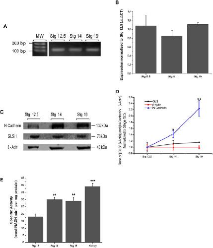 Figure 1. Expression and functionality of GLS1 during neurulation. (A) PCR assay revealed the presence of GLS transcripts at all neurulation stages and also in the adult brain (n = 5). (B) Transcript quantification using the qPCR assay was normalized to early neurulation. The graph does not show significant differences between stages (n = 6). (C) Protein samples obtained from embryos at stg 12.5, stg 14, and stg 19 were analyzed using the western blot assay to determine GLS1 expression (1:250), using β-actin as a loading control (1:300) and N-cadherin (1:1,000) as a neural tissue positive control. The results revealed the presence of protein in all samples (n = 6). (D) Quantification of western blot results as ratio [GLS/β-actine] and [N-cadherin/β-actin] demonstrate that GLS1 levels are constant during neurulation. (E) GLS1 specific activity expressed as nmol NADH minâ1 per protein mass (mg). The graph indicates that GLS1 activity increases in stg 14 and remains the same in stg 19, in both cases the activity is significantly lower than kidney, used as a positive control (n = 8). Results expressed as mean ± SEM, *p < 0.05; **p < 0.01; ***p < 0.001. PCR and WB original results were added to Supplementary Figure S3.