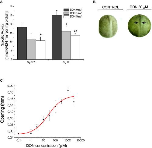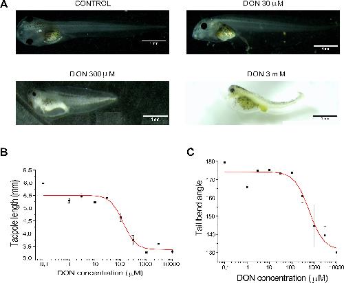 (B) Higher concentrations of DON result in a shortening of tadpole length. The maximal effect was obtained with 1 mM of DON (IC50 of 124 ± 35 µM).