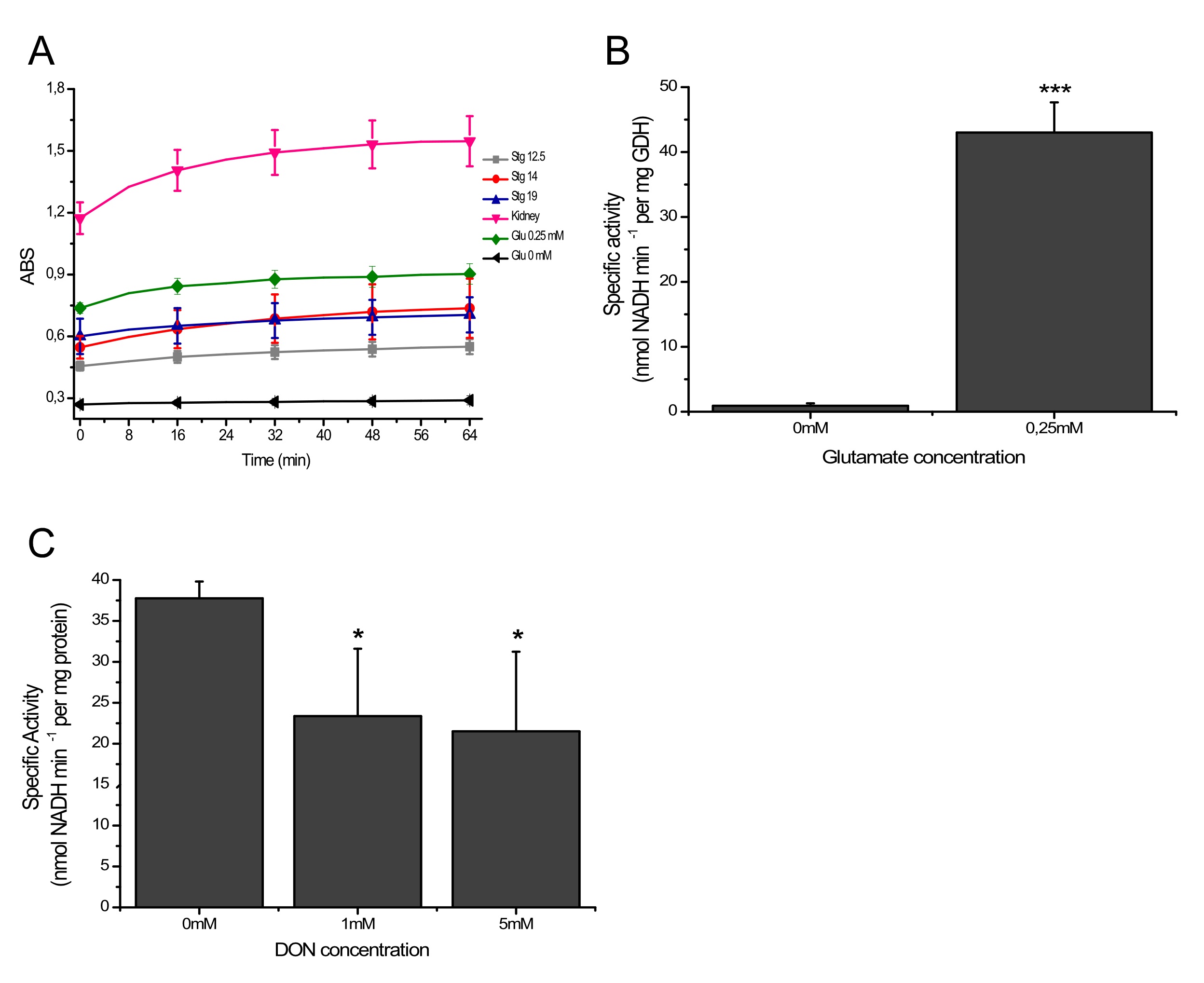 Supplementary Figure S1. (A) Temporal register of enzymatic activity assay. Absorbance was measured at 340nm (as NADH production) for embryo samples (stg 12.5, stg14 and stg 19) and kidney from adult X. laevis (n = 6). Controls were established with different amounts of glutamate (0 and 0.25 mM). The curve shows activity in all embryo samples and higher activity in adult kidney. (B) Specific GDH activity of glutamate controls 0 (0.9 ± 0.4) and 0.25 mM (42.9 ± 4.7). (C) Inhibition of enzymatic activity of GLS1 using DON in kidneytissue. GLS1 specific activity is significantly reduced with DON concentrations of 1 and 5 mM (n = 6) (0 mM: 37.8 ± 2.1; 1 mM: 23.4 ± 8.2; 5 mM: 21.5 ± 9.7).