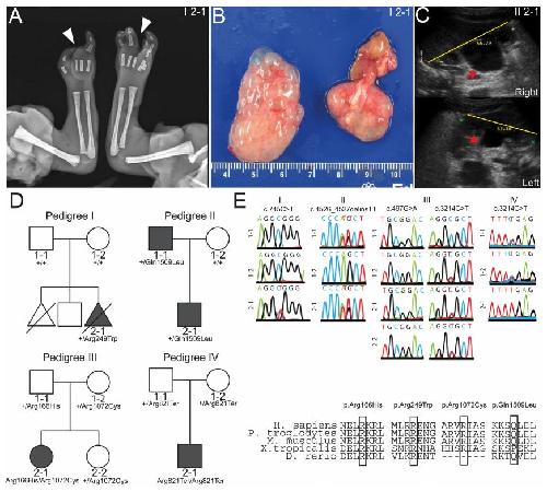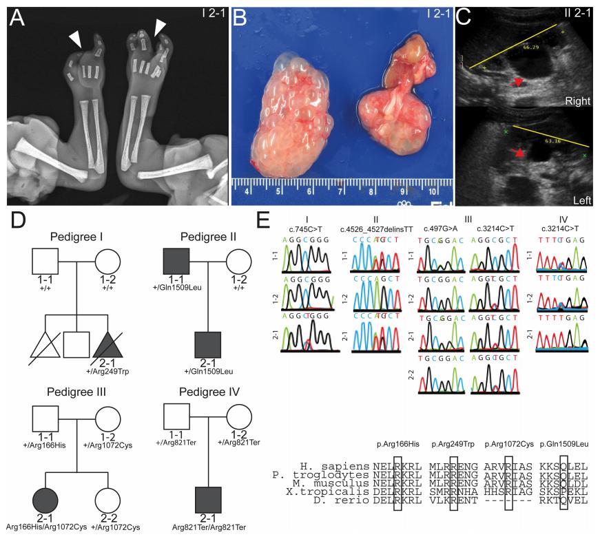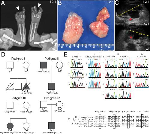 Figure 1. Whole exome sequencing identifies discs large 5 (DLG5) variants in patients. (A) Radiograph of patient I 2â1 fetal upper extremities reveals bilateral ectrodactyly. (B) I 2â1 fetal kidneys were largely cystic and dysplastic. (C) Ultrasound of II 2â1 kidneys show hydronephrosis. Yellow line depicts span of kidney and red arrows indicate dilated renal pelvis. (D) Pedigrees depict families in which the DLG5 variants were identified. (E) Sanger sequencing confirming variant allele presence and amino conservation through phylogeny for the mutated allele of DLG5. |