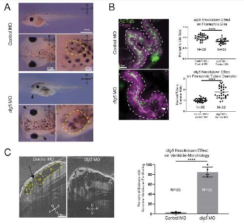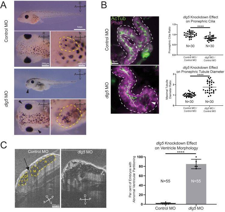 BACKGROUND: Cilia are dynamic cellular extensions that generate and sense signals to orchestrate proper development and tissue homeostasis. They rely on the underlying polarisation of cells to participate in signalling. Cilia dysfunction is a well-known cause of several diseases that affect multiple organ systems including the kidneys, brain, heart, respiratory tract, skeleton and retina. METHODS: Among individuals from four unrelated families, we identified variants in discs large 5 (DLG5) that manifested in a variety of pathologies. In our proband, we also examined patient tissues. We depleted dlg5 in Xenopus tropicalis frog embryos to generate a loss-of-function model. Finally, we tested the pathogenicity of DLG5 patient variants through rescue experiments in the frog model. RESULTS: Patients with variants of DLG5 were found to have a variety of phenotypes including cystic kidneys, nephrotic syndrome, hydrocephalus, limb abnormalities, congenital heart disease and craniofacial malformations. We also observed a loss of cilia in cystic kidney tissue of our proband. Knockdown of dlg5 in Xenopus embryos recapitulated many of these phenotypes and resulted in a loss of cilia in multiple tissues. Unlike introduction of wildtype DLG5 in frog embryos depleted of dlg5, introduction of DLG5 patient variants was largely ineffective in restoring proper ciliation and tissue morphology in the kidney and brain suggesting that the variants were indeed detrimental to function. CONCLUSION: These findings in both patient tissues and Xenopus shed light on how mutations in DLG5 may lead to tissue-specific manifestations of disease. DLG5 is essential for cilia and many of the patient phenotypes are in the ciliopathy spectrum.