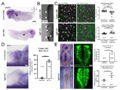 Figure 4 Knockdown of discs large 5 (dlg5) in Xenopus embryos causes cell polarity and Hedgehog signalling dysfunction. (A) Representative images of dnah9 in situ hybridisation in control MO and dlg5 MO sides of a stage 28 embryo depict fainter expression signal in the dlg5 depleted side. (B) Representative transverse sections of control MO and dlg5 MO sides of a stage 28 embryo reveal the more basal location of cells expressing the dnah9 marker of MCC cell fate. (C) Representative immunofluorescence images and quantitation of AcTub-positive ciliated cells/area and Lectin-positive goblet cells/area in control MO and dlg5 MO sides of a stage 28 embryo demonstrate the decreased density of MCCs and concomitant increased density of goblet cells in dlg5 depleted Xenopus epidermis. (D) Representative WISH for foxf1 Hedgehog target expression in control MO and dlg5 MO stage 45 pronephroi demonstrate the decreased Hedgehog signalling activity in dlg5 depleted pronephroi. (E) Representative expression and quantitation of ptch1 in control MO and dlg5 MO stage 45 brain ventricles as well as representative expression and quantitation of Pax6 in control MO and dlg5 MO stage 45 fourth ventricle demonstrate a decrease in ptch1 expression and expansion of Pax6. Black dotted line delineates bounds of the brain and white dotted line delineates bounds of fourth ventricle floor. A, anterior; D, dorsal; P, posterior; V, ventral. Statistical tests carried out as two-tailed t-tests for cell density (C) and Pax6 expression (E) and unpaired t-tests for foxf1 (D) and ptch1 (E) expression with ***p<0.005âand ****p<0.0001. Bars indicate mean and SD of individual values (EâPax6 expression) or replicate means (D and Eâfoxf1 or ptch1 expression). |