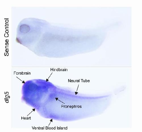 dlg5 (discs large homolog 5) gene expression in Xenopus tropicalis embryo, assayed via in situ hybridization, NF stage 36, lateral view, anterior left, dorsal up. |