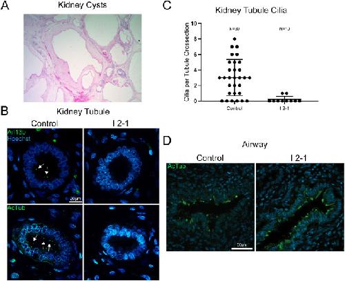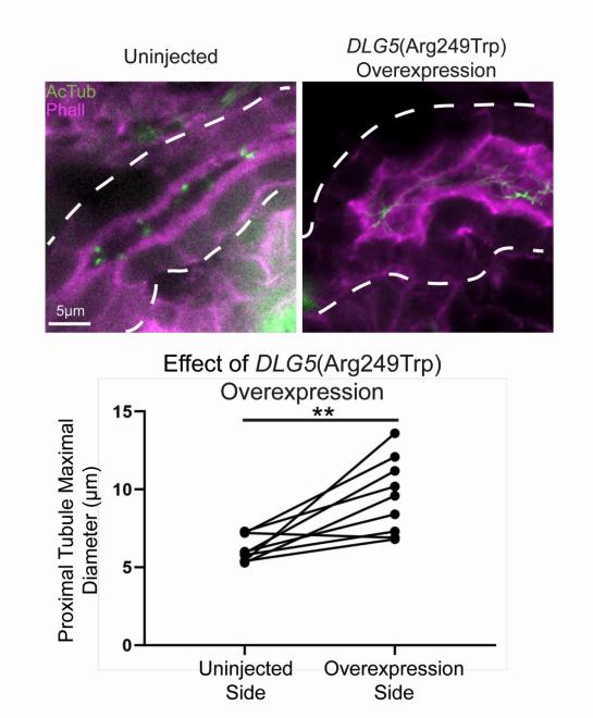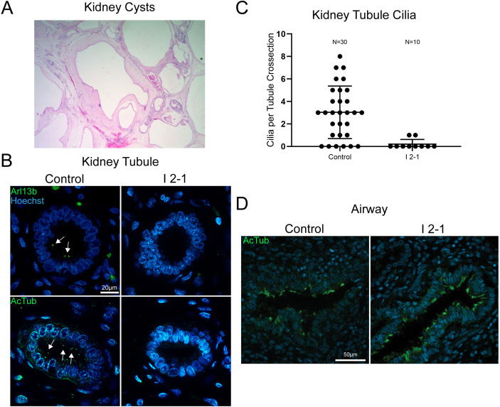 Figure 5. Proband tissue bearing discs large 5 (DLG5) variant c.745C>T (p.Arg249Trp) displays tissue-specific deficits in ciliation. (A) Representative H&E stain of I 2–1 kidney showing cystic morphology. (B) Control 23 weeks and I 2–1 weeks fetal kidney tissue cross-section immunofluorescence labelling of cilia Arl13b or acetylated tubulin show a loss of cilia in DLG5 variant tissue. (C) Quantitation of cilia number in each cross-sectional kidney tubule analysed. (D) Control 23 weeks and I 2–1 weeks fetal lung airway tissue cross-section immunofluorescence labelling of cilia acetylated tubulin shows intact airway ciliation in DLG5 variant tissue. Bars indicate mean and SD of individual counts. |