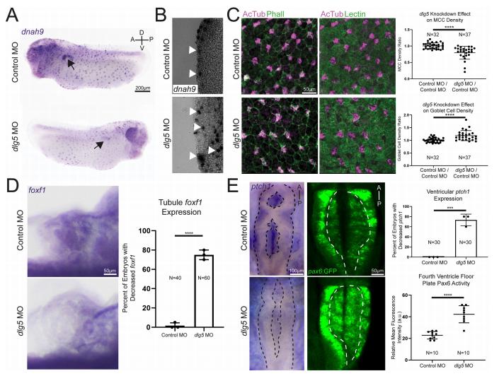 Figure 4. Knockdown of discs large 5 (dlg5) in Xenopus embryos causes cell polarity and Hedgehog signalling dysfunction. (A) Representative images of dnah9 in situ hybridisation in control MO and dlg5 MO sides of a stage 28 embryo depict fainter expression signal in the dlg5 depleted side. (B) Representative transverse sections of control MO and dlg5 MO sides of a stage 28 embryo reveal the more basal location of cells expressing the dnah9 marker of MCC cell fate. (C) Representative immunofluorescence images and quantitation of AcTub-positive ciliated cells/area and Lectin-positive goblet cells/area in control MO and dlg5 MO sides of a stage 28 embryo demonstrate the decreased density of MCCs and concomitant increased density of goblet cells in dlg5 depleted Xenopus epidermis. (D) Representative WISH for foxf1 Hedgehog target expression in control MO and dlg5 MO stage 45 pronephroi demonstrate the decreased Hedgehog signalling activity in dlg5 depleted pronephroi. (E) Representative expression and quantitation of ptch1 in control MO and dlg5 MO stage 45 brain ventricles as well as representative expression and quantitation of Pax6 in control MO and dlg5 MO stage 45 fourth ventricle demonstrate a decrease in ptch1 expression and expansion of Pax6. Black dotted line delineates bounds of the brain and white dotted line delineates bounds of fourth ventricle floor. A, anterior; D, dorsal; P, posterior; V, ventral. Statistical tests carried out as two-tailed t-tests for cell density (C) and Pax6 expression (E) and unpaired t-tests for foxf1 (D) and ptch1 (E) expression with ***p<0.005 and ****p<0.0001. Bars indicate mean and SD of individual values (E—Pax6 expression) or replicate means (D and E—foxf1 or ptch1 expression). |