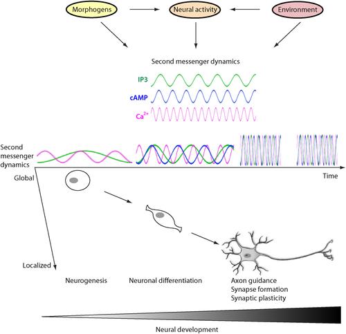 Figure 2. Integration of diverse developmental cues by second messenger signaling. Morphogenetic proteins, neural activity and environmental factors all converge in characteristic second messenger dynamics that vary from global to localized as neural cells differentiate and mature. The kinetics of second messenger signaling are developmentally regulated due to temporal changes in developmental cues and in expression and activation profiles of ion channels and signaling molecules. |