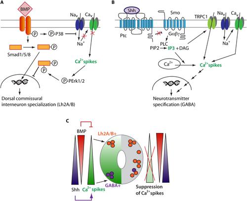 Figure 1. Interplay between Ca2+ spike activity and morphogenetic proteins in the developing spinal cord. (A) BMP signaling recruits p38 MAPK that phosphorylates and inhibits Nav1.6, thus decreasing Ca2+ spikes in embryonic spinal neurons. Low levels of Ca2+ spike activity are necessary for the specification of dorsal commissural spinal neurons through a Smad1/5/8âdependent mechanism. Based on the study by Swapna and Borodinsky (2012). (B) Shh activates Smo, which recruits PLC leading to IP3 transients that correlate with TRPC1 and Cavâmediated Ca2+ spikes that regulate neurotransmitter specification in developing spinal neurons. Based on the study by Belgacem and Borodinsky (2011). (C) The opposing dorsoventral gradients of BMP and Shh generate a gradient of Ca2+ spike activity that is important for spinal neuron differentiation. Ptc: Patched1; Smo: Smoothened; PLC: phospholipase C. |