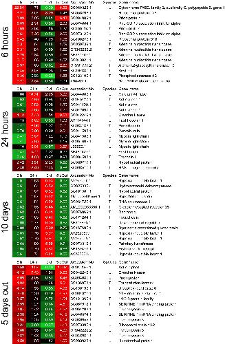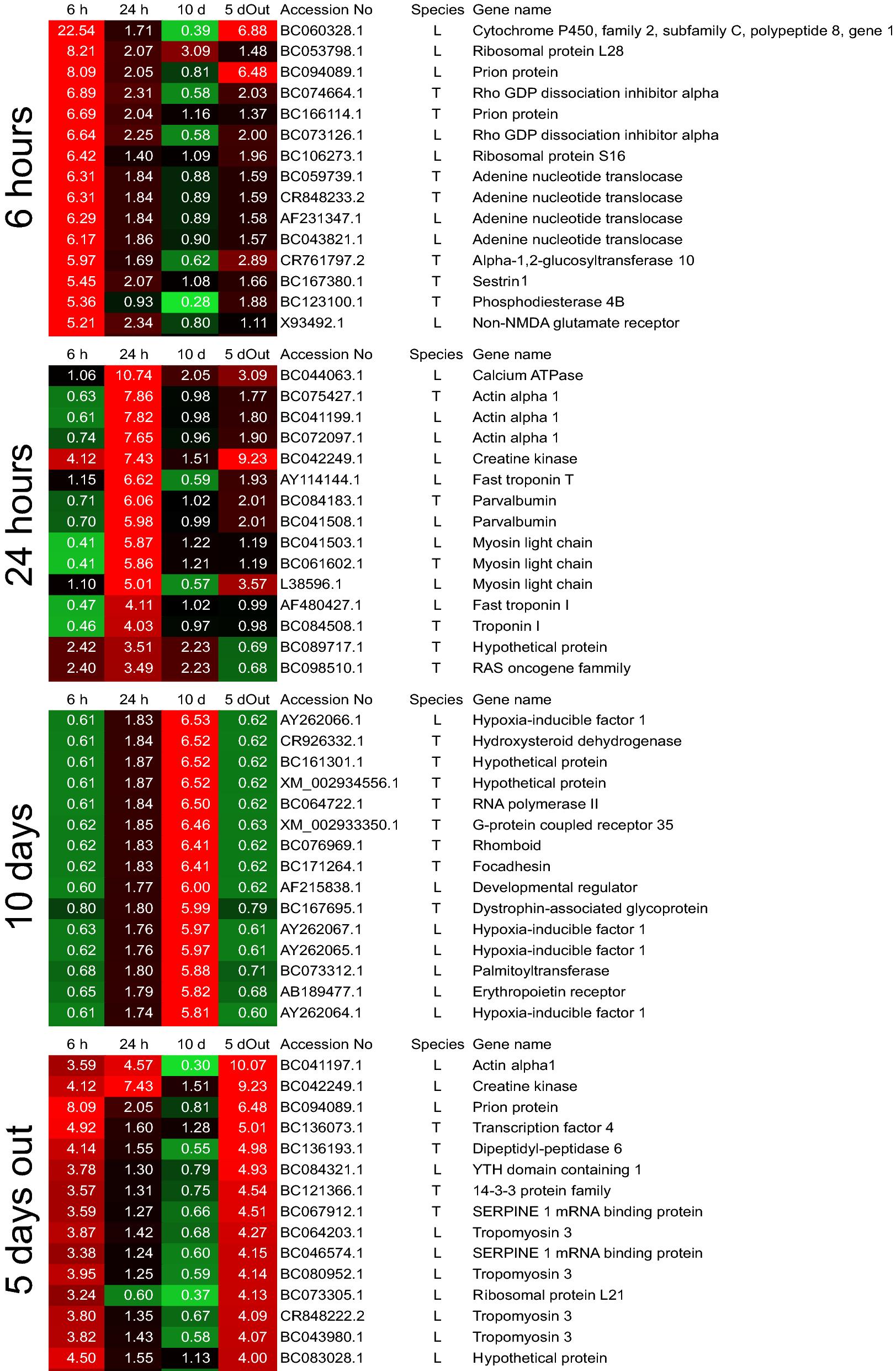 Figure 2. Heat map using 3â²-tag digital gene expression profiles from Xenopus laevis whole brain tissues. Gene expression profiling was performed using the top 15 genes that were expressed by over 1,000 tags from each of the experimental groups described in Fig. 1. The numbers on the heat map indicate the total number of tags expressed for each gene in the experimental and control groups. Accession No: gene number obtained from the NCBI database. Species: âLâ indicates Xenopus laevis, and âTâ indicates Xenopus tropicalis. The heat map colors and numbers indicate the fold changes in gene expression compared with that of the control. |